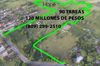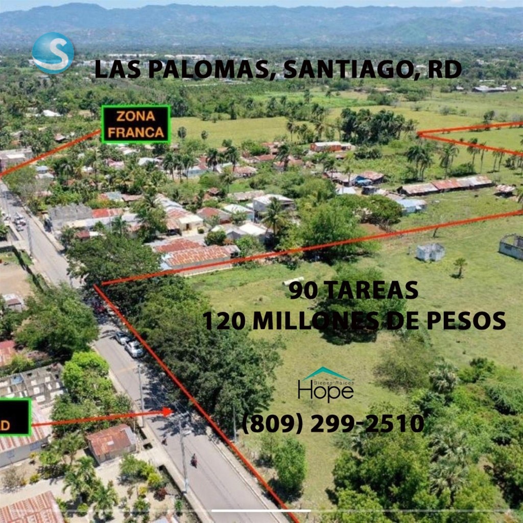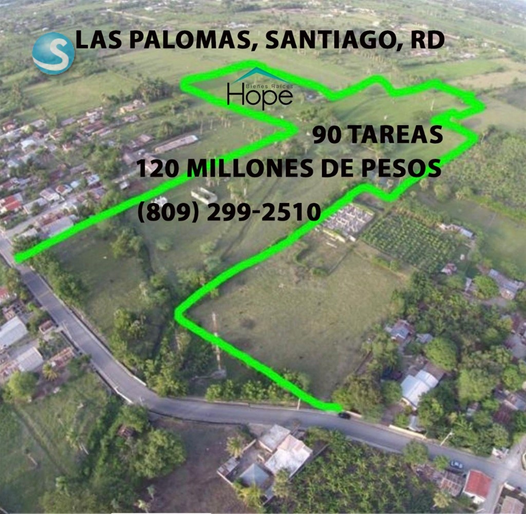 Vendo en Las Palomas, Santiago, RD 90 tareas de tierra aptas para cualquier proyecto residencial o comercial. Título limpio y deslindado. A borde de carretera asfaltada. Inversión: RD$120,000,000 millones de pesos dominicanos. Para más información y venta, favor de llamar al (809) 299-2510. Con gusto le atenderemos. HOPE BIENES RAÍCES