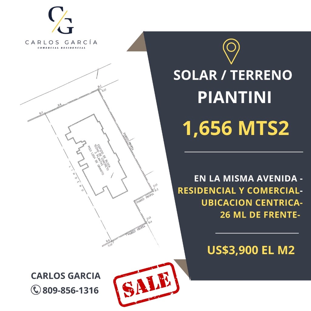Solar en venta en el Ensanche Piantini – Santo Domingo Excelente solar en venta en Piantini, una de las zonas más exclusivas y de mayor plusvalía de Santo Domingo Distrito Nacional. El terreno cuenta con 1,656 metros cuadrados y 26 metros lineales de frente, ideal para el desarrollo de proyectos residenciales, comerciales o mixtos. Ubicado en el corazón de Piantini, este solar premium ofrece una ubicación estratégica cercana a avenidas principales, centros comerciales, bancos, restaurantes y torres de lujo. Características destacadas: • Superficie: 1,656 m² • Frente: 26 metros lineales • Vocación residencial y comercial • Ubicación céntrica en el Ensanche Piantini • Alta plusvalía inmobiliaria Este terreno en venta en Piantini representa una oportunidad única de inversión en Santo Domingo, ideal para desarrolladores e inversionistas que buscan construir en una de las zonas más demandadas del país.