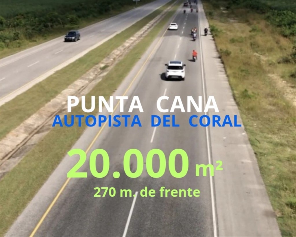 En PUNTA CANA - A 4 kms de la "rotonda" de Punta Cana , se venden : 20.000 m² Con 270 m. de frente a la Autopista Con +/- 150 m. de fondo Con Titulo 55 dolares/m² *** Ideal para construccion COMERCIAL y/o INDUSTRIAL 200.000 m² 270 m. de frente a la Autopista Con TITULO 60 dolares/m² - A 5 kms de la "rotonda" de Punta Cana , se venden : 600.000 m² 350 m. de frente a la Autopista Con TITULO 35 dolares/m² - Pasado el PEAJE (fireccion Higuey) , a +/- 500 metros , se venden : 4 millones de m² con 1.500 metros de frente a la Autopista *** Se Subdivide Con TITULO PRECIO ......... 19 $/m²