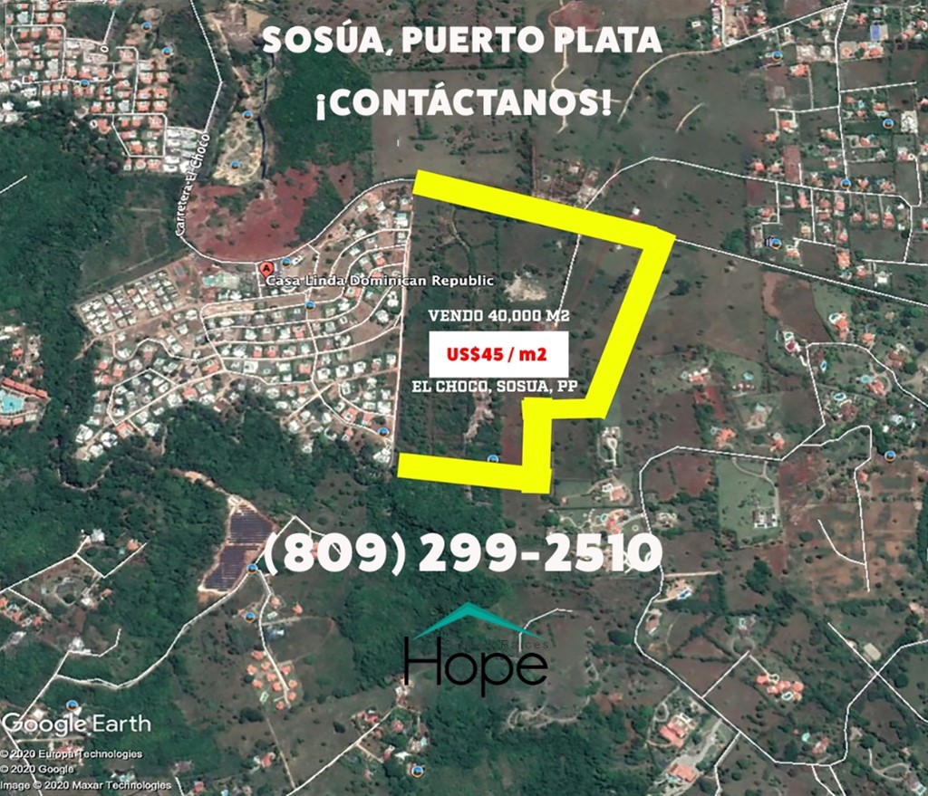 HBR544 - IDEAL PARA DESARROLLO DE VILLAS TURÍSTICAS Situado en la Carretera del Choco, son 40,000 metros cuadrados de terreno, al lado del complejo turístico Casa Linda. Título y deslinde. Precio: US$1,450,000 dólares americanos. Información y venta llame o WhatsApp a la Lcda. Esperanza Reinoso al (809) 299-2510. For English call or WhatsApp to +1 829-758-7711. HOPE BIENES RAÍCES