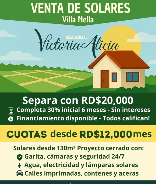 Venta de solares en la victoria santo domingo norte Separe con$ 20,000 Solares desde 130 MTS Proyecto serrado Garita Cámara Agua Electricidad 30 % de inicial Puede completar en 6 meses Financiamiento disponible