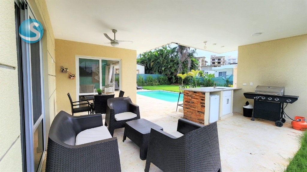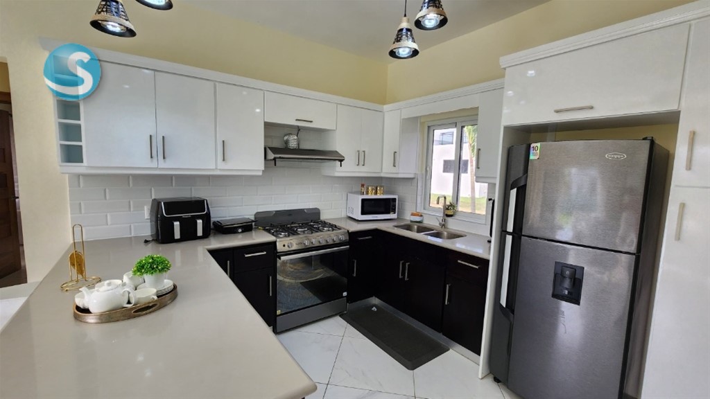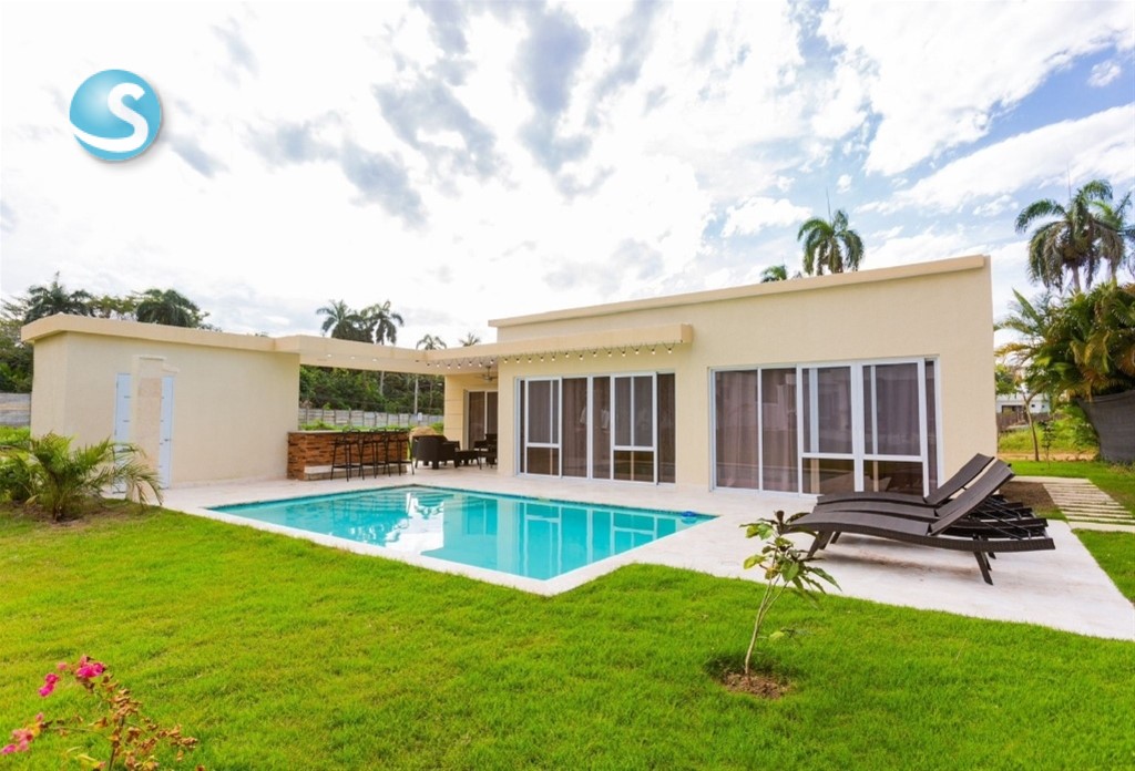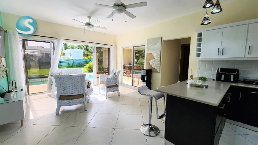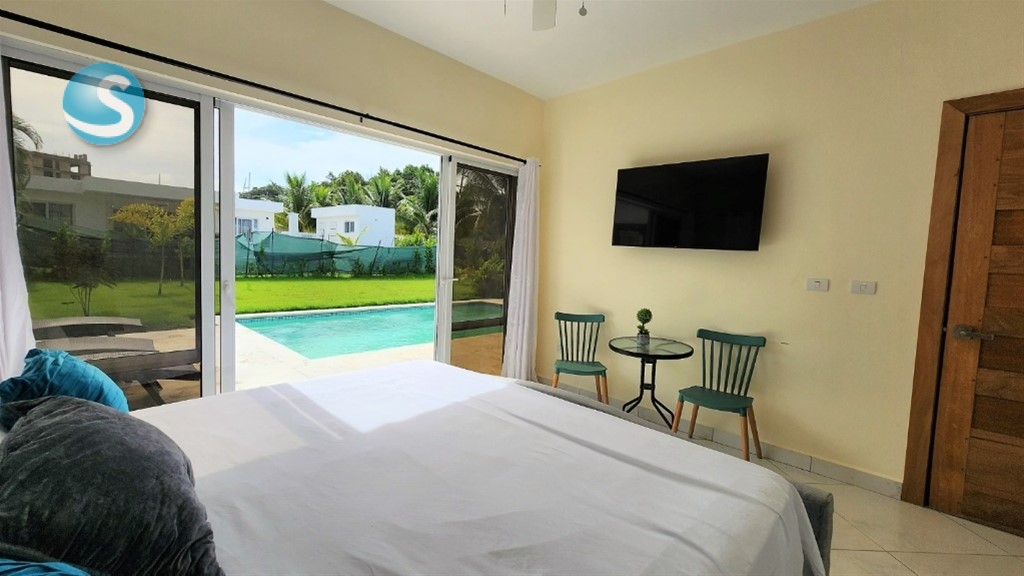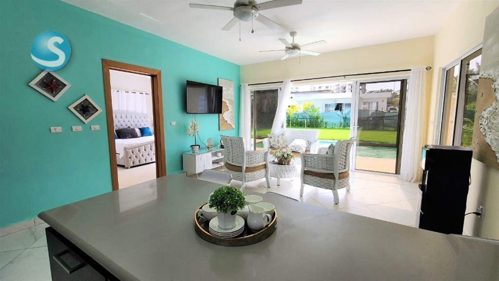 Villa en Venta en Encuentro, Cabarete – Amueblada Hermosa villa moderna, construida en 2024, ideal para residencia o inversión turística. Características: Solar: 464.59 m² Construcción: 110.39 m² 2 habitaciones con aire acondicionado 2.5 baños Sala Cocina moderna Área de barbacoa Piscina privada Parqueo para 2 vehículos Totalmente amueblada Residencial con: Seguridad 24/7 Planta eléctrica Mantenimiento de áreas comunes Mantenimiento: USD 262 mensual Ubicación: A 29 km del aeropuerto y 0.75 km de la playa Precio: USD 285,000