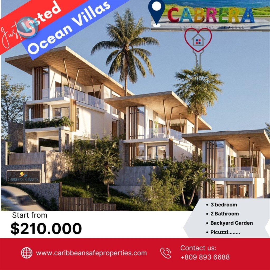 Vive la experiencia de invertir donde otros solo sueñan vacacionar Imagina despertar cada día con impresionantes vistas al Atlántico, rodeado de playas paradisíacas y rincones naturales únicos. Este exclusivo proyecto de 3 villas privadas en Cabrera no es solo un hogar, es una oportunidad de inversión en una de las zonas con mayor proyección turística del Caribe. Comodidad y lujo en cada detalle: -Amplias villas de 2 niveles, 3 habitaciones y 2 baños. -Picuzzi privado, terraza panorámica y firepit frente al mar para disfrutar momentos inolvidables. -Espacios modernos: sala, comedor y cocina integrados con doble altura que potencian la elegancia. -2 parqueos privados para tu conveniencia. Ubicación estratégica: A solo minutos de playas reconocidas como Playa Grande, Playa Diamante y Laguna Dudú, además de supermercados, restaurantes y el vibrante malecón de Cabrera. Todo lo que necesitas, a tu alcance. Beneficio de inversión: -Precios de pre-venta desde USD$210,000. -Reserva con solo USD$2,000. -Plan de pago flexible desde un 10% de inicial. -Entrega proyectada: 4to trimestre 2026, ideal para quienes buscan revalorización asegurada. No dejes pasar la oportunidad de asegurar una villa que combina lujo, naturaleza y alta rentabilidad en una de las costas más codiciadas de República Dominicana. Escríbenos hoy y da el primer paso hacia tu inversión frente al mar.