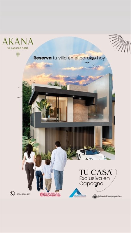 Hermoso proyecto de villas ideal para vivir o invertir. ¡Descubre la Elegancia en Ciudad Las Canas, Cap Cana!, villas de 3 dormitorios, 3.5 baños, amplia sala. comedor, amplia terraza.. Donde el Estilo Encuentra el Paraíso Disfruta de un estilo de vida incomparable en nuestras villas diseñadas con la máxima atención a los detalles. Desde impresionantes vistas panorámicas hasta exquisitos interiores, cada rincón refleja la calidad y la distinción que mereces. Características Destacadas: -Acceso exclusivo a playas privadas. -Diseño arquitectónico moderno y elegante. -Amplios espacios verdes y áreas de recreación. -Beneficios de Vivir en Akana: Ubicación Privilegiada: A minutos de restaurantes gourmet, tiendas de clase mundial y campos de golf de renombre. -Seguridad y Tranquilidad: Ciudad Las Canas ofrece un entorno seguro y tranquilo para que tú y tu familia disfruten al máximo. ¡Vive el Lujo, Vive en Akana! - Agenda tu Tour Personalizado hoy mismo: - 809-986-4112