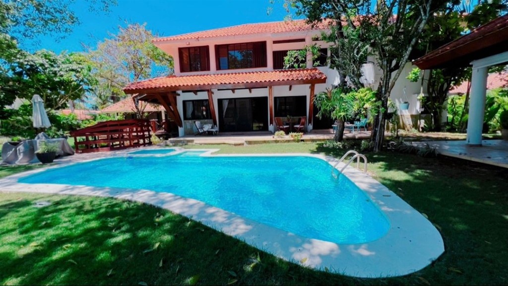 Hermosa casa en juan dolio metro country club con 600 metros de construcción y 2,000 de terreno con 4 dormitorios, estar familiar y área de entretenimiento techada. 2 Terrazas , piscina , jacuzzi, vista al campo de golf, incluye area de juevos y entretenimiento.