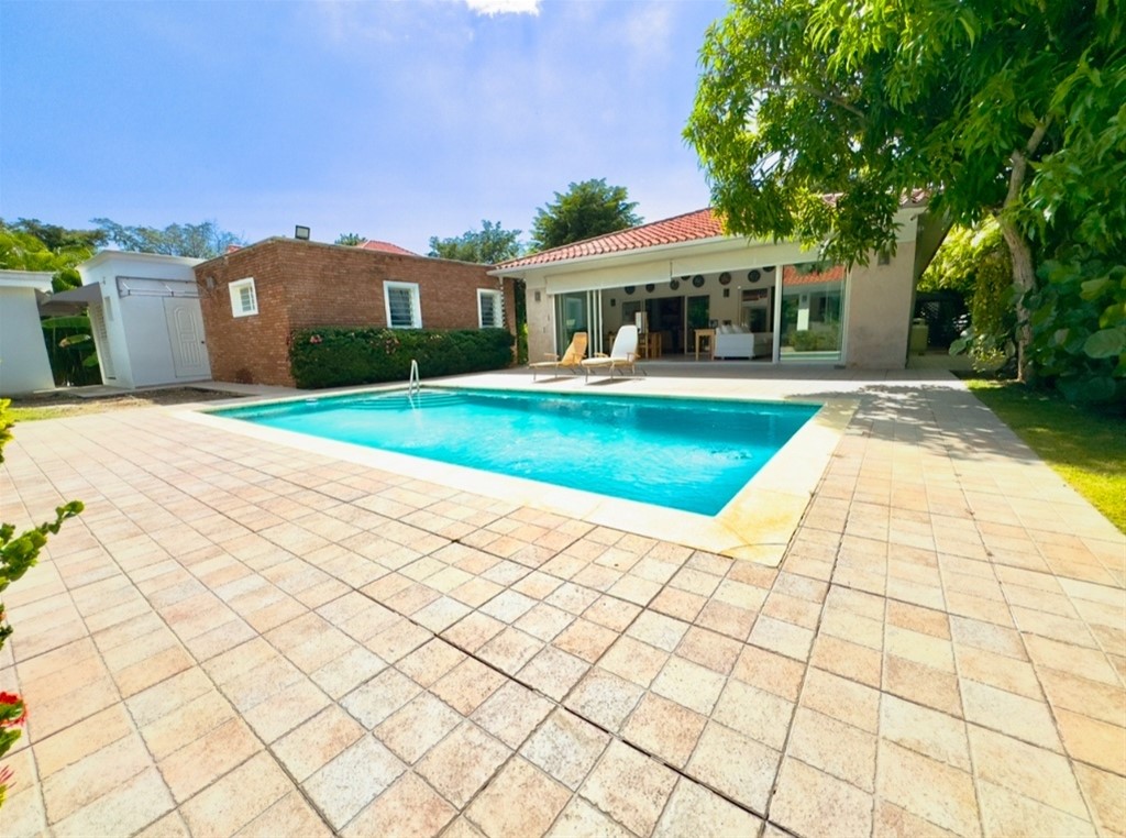 Hermosa y bien ubicada villa de un nivel en Metro Country Club, 1, 073 mts2 de terreno 406 mts2 de construcción - Distribución: Parqueo para 8 vehículos, dos bajo techo. - Recibidor. - Sala. -Ante sala al Estudio. - Estudio con Baño Completo. - Comedor. - Cocina moderna - Área de lavado. - Dormitorio y baño empleada. - Terraza - Comedor. - 4 dormitorios con sus baños. - Área Exterior: - Piscina con dos sistemas. - Cuarto de máquinas. - Cuarto de Almacenaje. -Gazebo. * Observación: El patio está rodeado de árboles frutales y plátanos.
