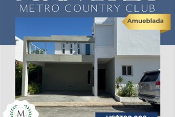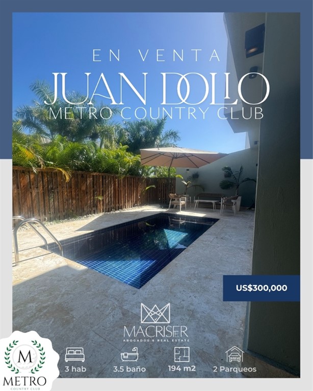 Villa Amueblada Estilo Townhouse | Metro Country Club – Juan Dolio Exclusiva villa de dos niveles, totalmente amueblada, ubicada dentro de Metro Country Club, uno de los complejos residenciales más prestigiosos y completos de Juan Dolio. Ideal para vivir, vacacionar o invertir. Dimensiones: Terreno: 194.23 m² Construcción: 125.50 m² Distribución de la villa: 3 Habitaciones, cada una con su baño privado Medio baño de visita Sala Comedor Cocina Patio con piscina privada Terraza en tercer nivel Marquesina techada para 2 vehículos Villa estilo townhouse, moderna, funcional y lista para disfrutar. Amenidades de Metro Country Club: Campo de golf Los Marlins de 18 hoyos Campo de práctica y pro shop Casa club con restaurante Hoyo 19 – Juan Marichal Canchas de tenis iluminadas Piscinas y áreas sociales Amplias áreas verdes y jardines tropicales Acceso al club de playa Café del Sol Seguridad 24/7 Precio de venta: US$ 300,000 Una propiedad que combina lujo, naturaleza, deporte y estilo de vida caribeño en una sola inversión. Contáctame para más información o coordinar tu visita. Mariel Fernandez +1 (849) 356-5216