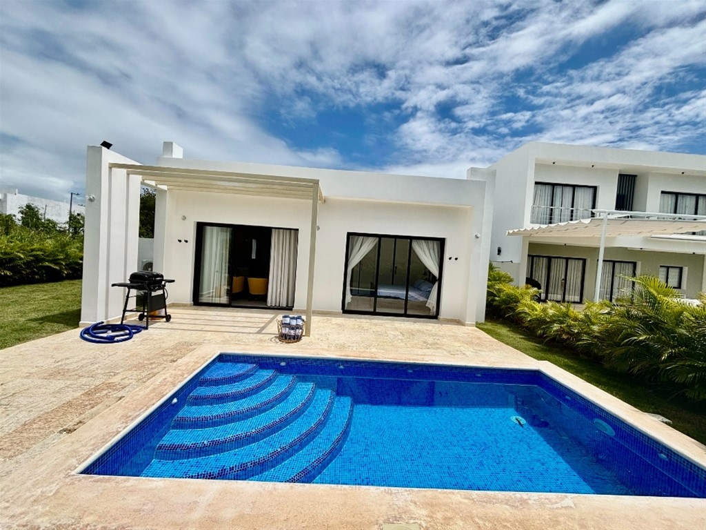 Alquiler de acogedora villa amueblada, en el exclusivo complejo turistico playa Nueva Romana, 3 habitaciones, 2.5 baños, cocina abierta con desayunador, area lavado con lavadora secadora, sala, comedor, area patio con piscina y BBQ, aires split, amueblado full, linea blanca completa. Se permiten rentas de 6 meses a 1 año. Mantenimiento incluido