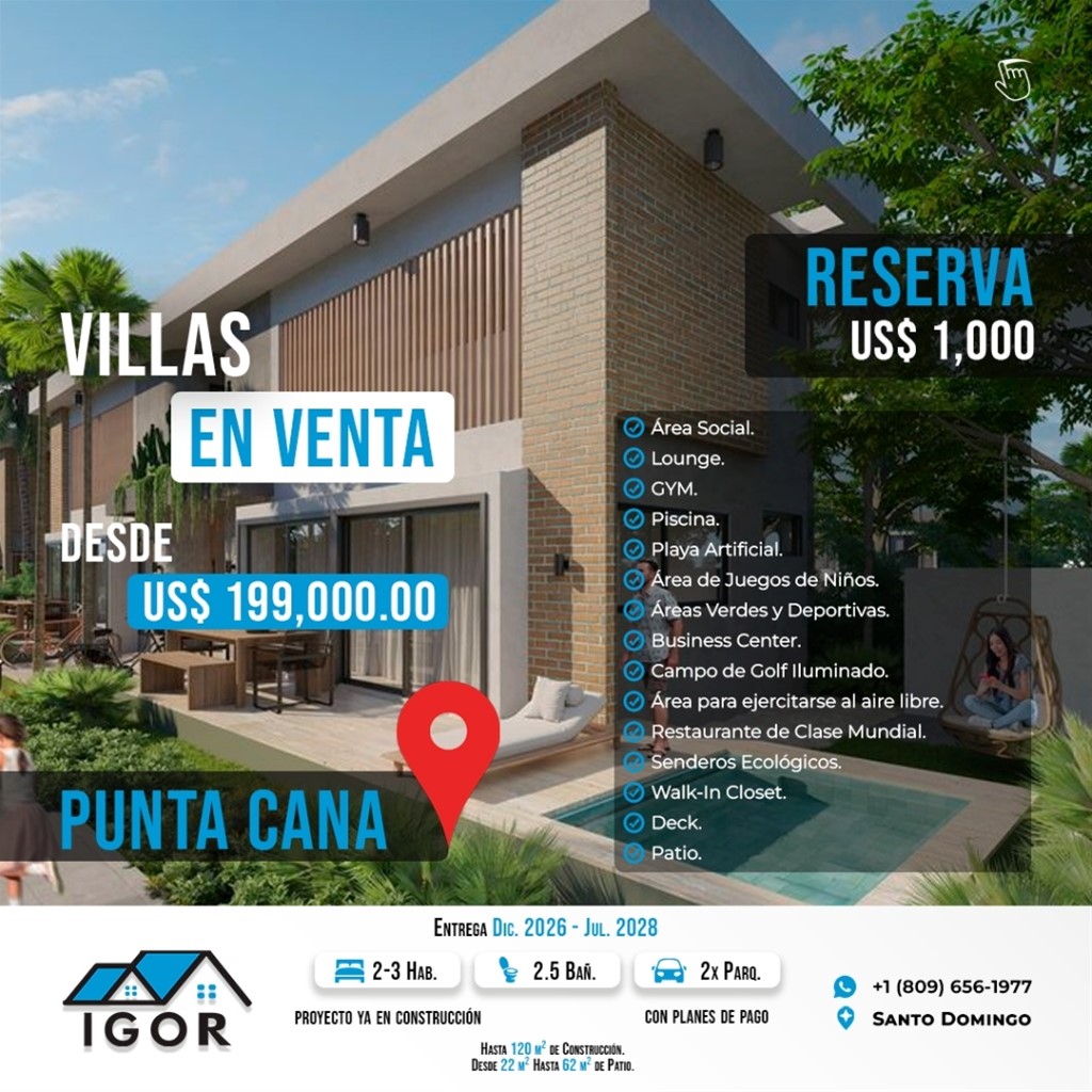 DESDE 199,000.00 HASTA 220,500.00 CARACTERISTICAS DEL PROYECTO 100 unidades tipo Towhouse de 3 habitaciones. Posibilidad de Townhouse de 2 habitaciones 120 mt2 de construcción y 22 a 77 mt2 de patio A/C en la hab. principal y secundaria Preinstalación de picuzz VENTAJAS DEL RESIDENCIAL -Mas de 1,000M2 de área social - Área lounge - Gimnasio -Piscina de adultos y niños - Juegos acuáticos y recreación infantil - 6 plazoletas - 5 parquecitos - Mas de 1KM de sendero - Área de picnic, BBQ y esparcimiento - Entrada vehicular doble vía y acceso peatonal - Airbnb Friendly - Frente al campo de Gol AMENIDADES DE VISTA CANA - Playa artificial de 24,000m2 -Lago de agua dulce - Senderos ecológicos -Campo de golf iluminado -Área de juegos para infantes y niños - Áreas verdes y deportivas. - Área para ejercitarse al aire libre - Business center - Restaurantes de clase mundial