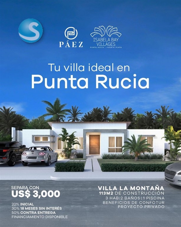 Isabela Bay – Un Proyecto Privado en Punta Rucia @isabelabay Villas y Lotes con Vistas al Mar – A Solo 5 Minutos de la Playa Descubre Isabela Bay, un exclusivo proyecto privado ubicado en el encantador destino turístico de Punta Rucia, donde las montañas se encuentran con el mar, creando un entorno natural único y vistas espectaculares. A solo cinco minutos de la playa de arenas blancas, este desarrollo ofrece dos tipologías de villas y lotes desde 400 m², ideales para construir, vacacionar o invertir. Un entorno rodeado de naturaleza, tranquilidad y belleza sin igual. ¿Por qué Punta Rucia? Punta Rucia es uno de los destinos más exclusivos y vírgenes del norte de República Dominicana. Famoso por su impresionante biodiversidad marina, sus aguas cristalinas, playas tranquilas y el icónico Cayo Arena, es el refugio ideal para quienes buscan desconectar y vivir en armonía con la naturaleza. Además, es una zona con alto potencial de crecimiento turístico e inmobiliario, lo que lo convierte en una excelente oportunidad de inversión. Tipologías Disponibles: VILLA LA MONTAÑA • 113 m² de construcción • 3 habitaciones | 2 baños • Desde US$ 225,000 Facilidades de Pago para las villas: • US$ 3,000 de separación • 20% de inicial • 30% en cuotas durante 18 meses sin intereses • 50% contra entrega (financiamiento disponible) financiamiento disponible con institución bancaria Proyecto acogido a CONFOTUR Benefíciate de exenciones fiscales por 15 años Contáctanos !!