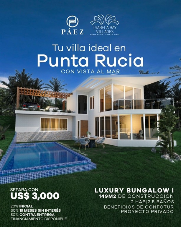 Isabela Bay – Un Proyecto Privado en Punta Rucia @isabelabay Villas y Lotes con Vistas al Mar – A Solo 5 Minutos de la Playa Descubre Isabela Bay, un exclusivo proyecto privado ubicado en el encantador destino turístico de Punta Rucia, donde las montañas se encuentran con el mar, creando un entorno natural único y vistas espectaculares. A solo cinco minutos de la playa de arenas blancas, este desarrollo ofrece dos tipologías de villas y lotes desde 400 m², ideales para construir, vacacionar o invertir. Un entorno rodeado de naturaleza, tranquilidad y belleza sin igual. ¿Por qué Punta Rucia? Punta Rucia es uno de los destinos más exclusivos y vírgenes del norte de República Dominicana. Famoso por su impresionante biodiversidad marina, sus aguas cristalinas, playas tranquilas y el icónico Cayo Arena, es el refugio ideal para quienes buscan desconectar y vivir en armonía con la naturaleza. Además, es una zona con alto potencial de crecimiento turístico e inmobiliario, lo que lo convierte en una excelente oportunidad de inversión. Tipologías Disponibles: LUXURY BUNGALOW I • Vista al mar • 149 m² de construcción • 2 habitaciones | 2.5 baños • Desde US$ 300,000 financiamiento disponible con institución bancaria Proyecto acogido a CONFOTUR Benefíciate de exenciones fiscales por 15 años Contáctanos !!