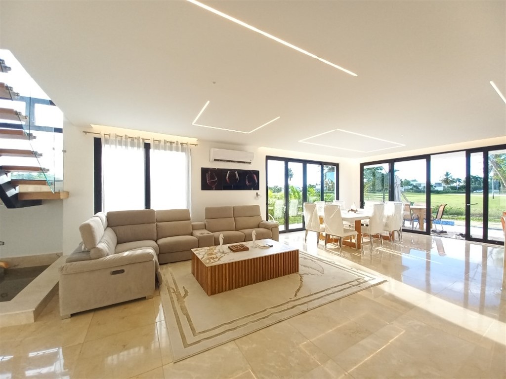 Hermosa casa en venta en Playa Nueva Romana, ubicada en un entorno exclusivo y rodeada de naturaleza. Un lugar perfecto para quienes buscan lujo, tranquilidad para vivir o vacacionar en el paraíso. Cuenta con 4 habitaciones cada una con su baño (una de ellas se encuentra en 1er nivel). Balcones en 3 de las habitaciones en el segundo nivel. 1/2 baño de visitas. 1 baño en el área de piscina. Cocina con finas terminaciones y completamente equipada. Despensa en cocina estilo walk in closet. Área de lavado. Patio con vistas al campo al campo de golf. Piscina con vistas al campo de golf. Sala y comedor de concepto abierto. Oficina o estudio cerrado. Espacio para 4 vehículos. La villa cuenta con una escalera interna que dirige al techo y su espacio puede ser adecuado para terraza abierta o lounge. Importante destacar que el complejo cuenta con: supermercado, gimnasio, espacio co-working, hoteles 5 estrellas, club de golf, PGA Ocean´s 4, playa y beach club, restaurantes, control de acceso y vigilancia 24/7. Contáctenos para más detalles e información de financiamiento.